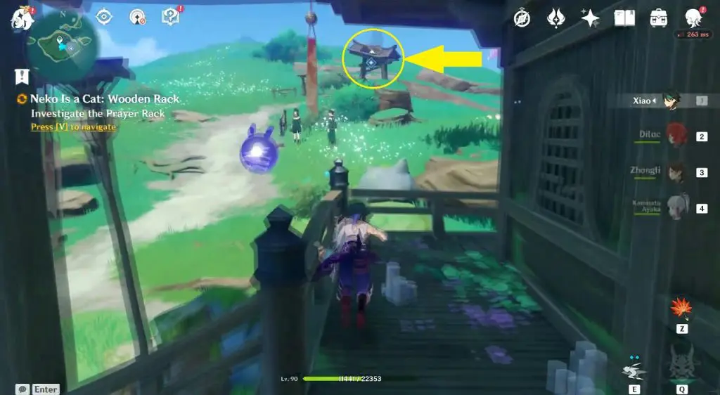 Go and talk to Neko the next day (Real Life) to start ‘Neko is a Cat: Wooden Rack’ World Quest. For this quest, you will have to Investigate the Prayer Rack. Turn left and go to the rack as shown below. Interact with it to repair the rack. This will complete the quest.