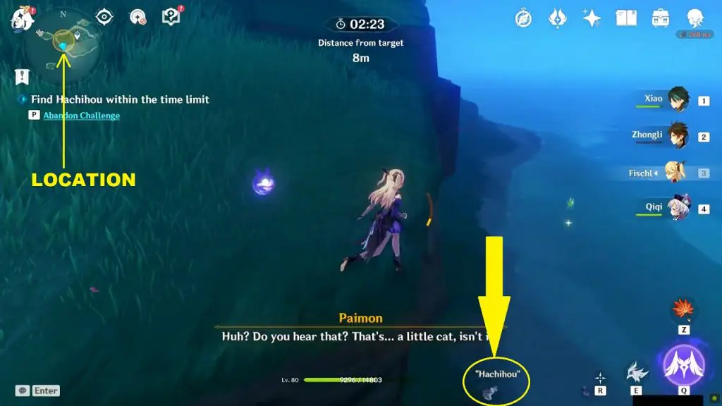 Go and talk to Neko the next day (Real Life) to start ‘Neko is a Cat: Shrine Recipe’ World Quest. First, you will have to talk to Taisuke and Eiko, whom you will find near the shrine. Next, you will have to talk to Kiminami Anna in Inazuma City as shown in the below picture. Bring her three servings of seagrass and she will give you Invigorating Kitty Meal. learn the recipe and cook three Invigorating Kitty Meals. Go back to Asase Shrine and feed the cats by filling three feeding bowls at marked locations as shown in the second picture below. This will complete the quest.