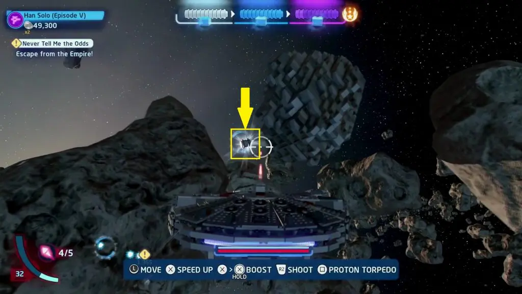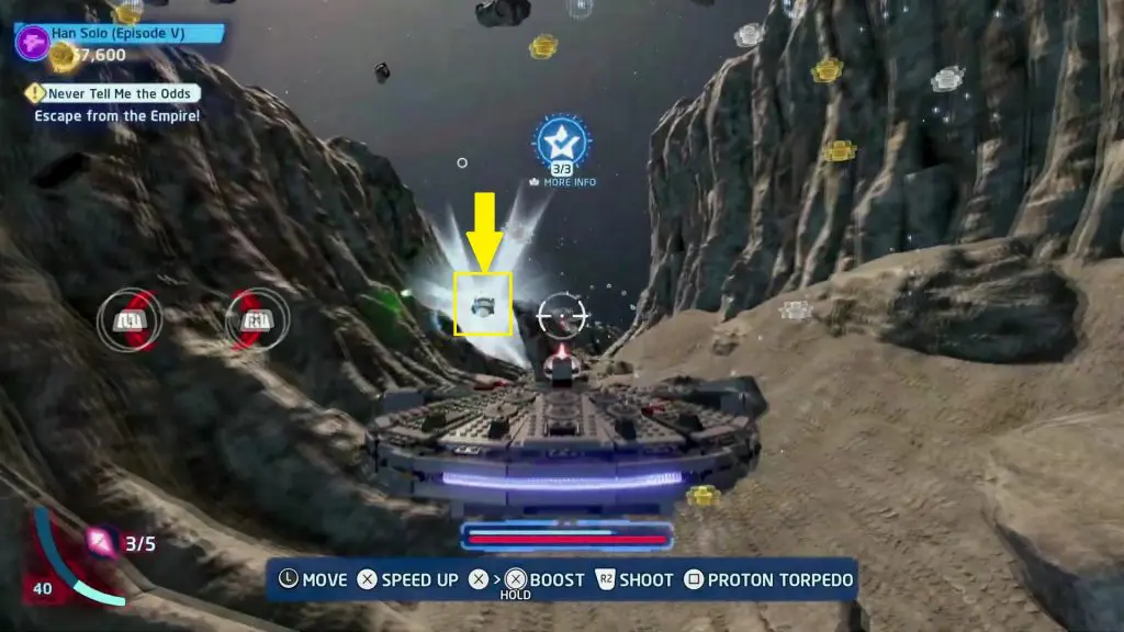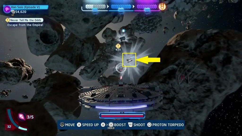 In the Asteroid field, destroy 5 Minikit-shaped debris as shown in the picture below to get a Minikit.