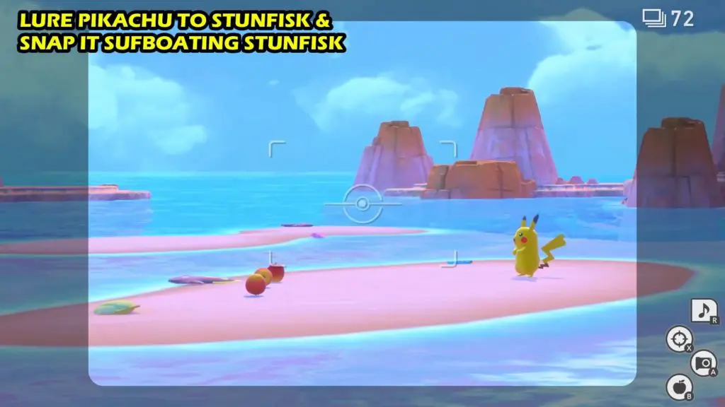 New Pokemon Snap: Near the Water’s Edge (How to Guide) Post published:May 4, 2021 Post category:New Pokemon Snap Pikachu 4 Star Pose | Near The Water's Edge Request: New Pokemon Snap Guide Professor Mirror will give you requests to do the ‘Near the Water’s Edge’ request. The request is to snap a 4-star picture of Pikachu surf boating.This request unlocks after reaching research level 3 at Beach (Day). Pikachu is on the beach and Stunfisk is on a small sand-island nearby. Lure Pikachu to Stunfisk by throwing fluffruits. When Pikachu gets near the Stunfisk, it’ll start surf boating the stunfisk (4-star pose). Take a snap of Pikachu surf boating to complete the request.