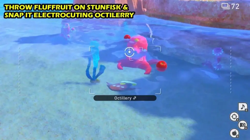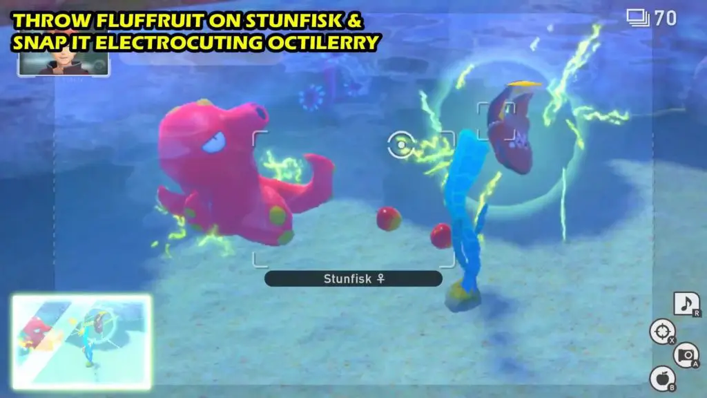 Professor Mirror will give you requests to do the ‘Hiding in the Sand’ request. The request is to snap a 4-stars picture of Stunfisk electrocuting Octillery.