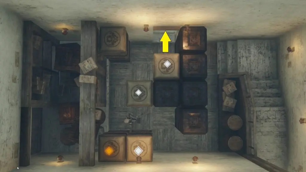 Move the boxes out of the way to access the back room and interact with the letters on the table. See above image for reference.