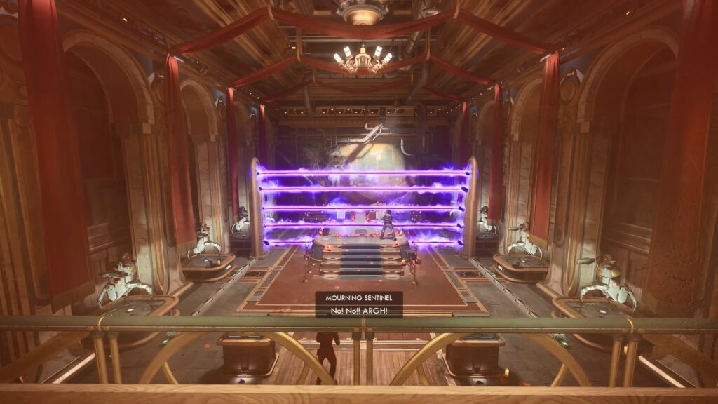 Now you can take either path (door) to reach the central room below. Defeat and loot the enemies there to find the Museum Docent for the Golden Shroud Display Key. You can use this key to unlock the armor stand display near the entrance and claim the unique Golden Shroud armor.