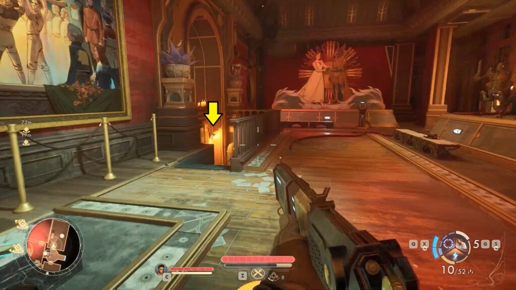 Once inside, you’ll find an armor display stand. Go behind the display stand and look below the large window to see two enemies.