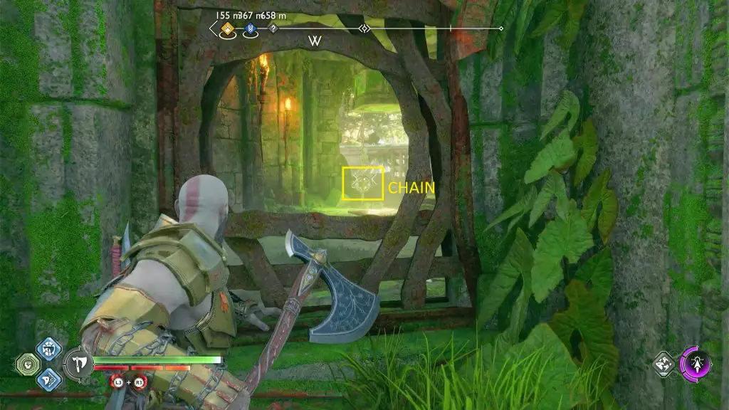 Go back to the previous window and hit the lock on the chain as shown in the picture below. This will make the weight hanging from the chain come down, opening the gate. Now enter the building to get the legendary chest.