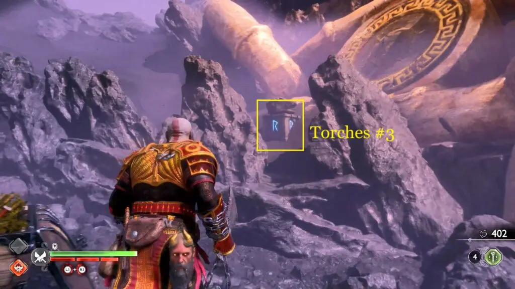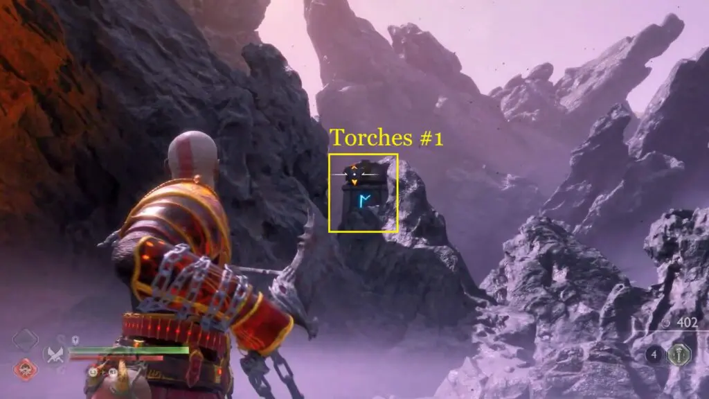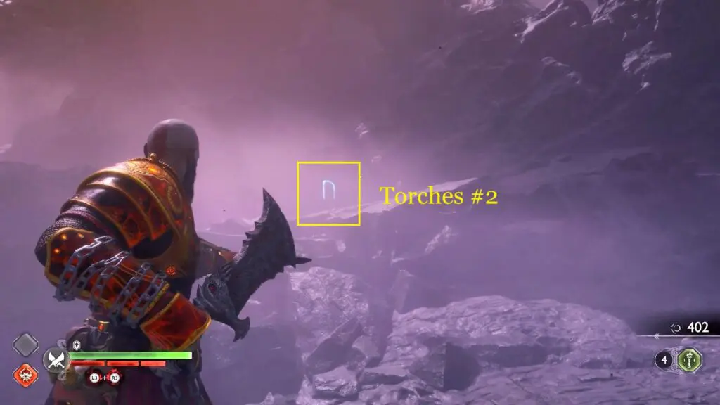 Torches #2 and #3 are located on the left side of the chest. Proceed to the left from the chest, and on the right side of the mountain wall, you’ll discover the second touch point.