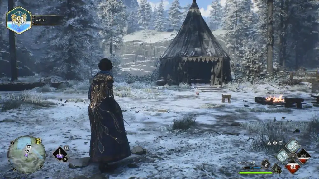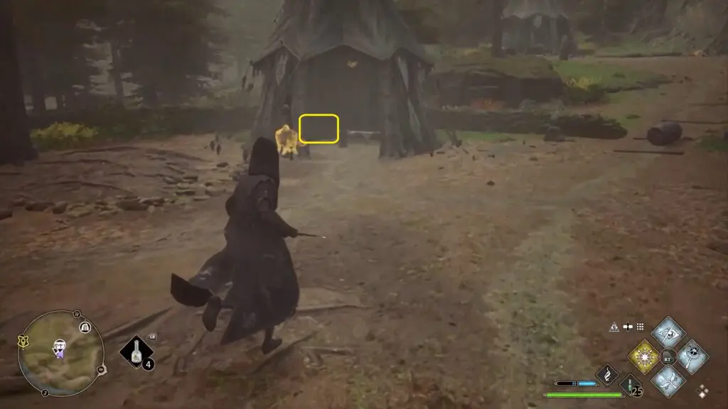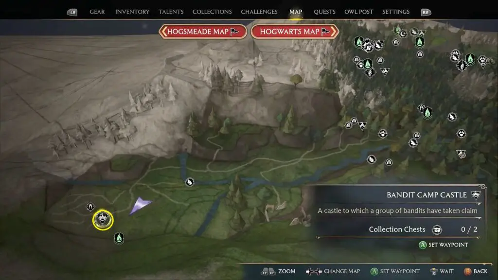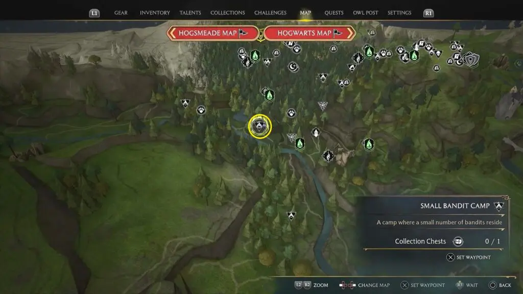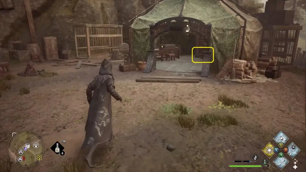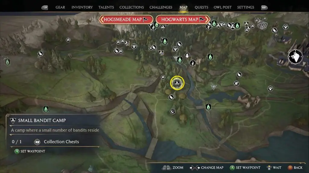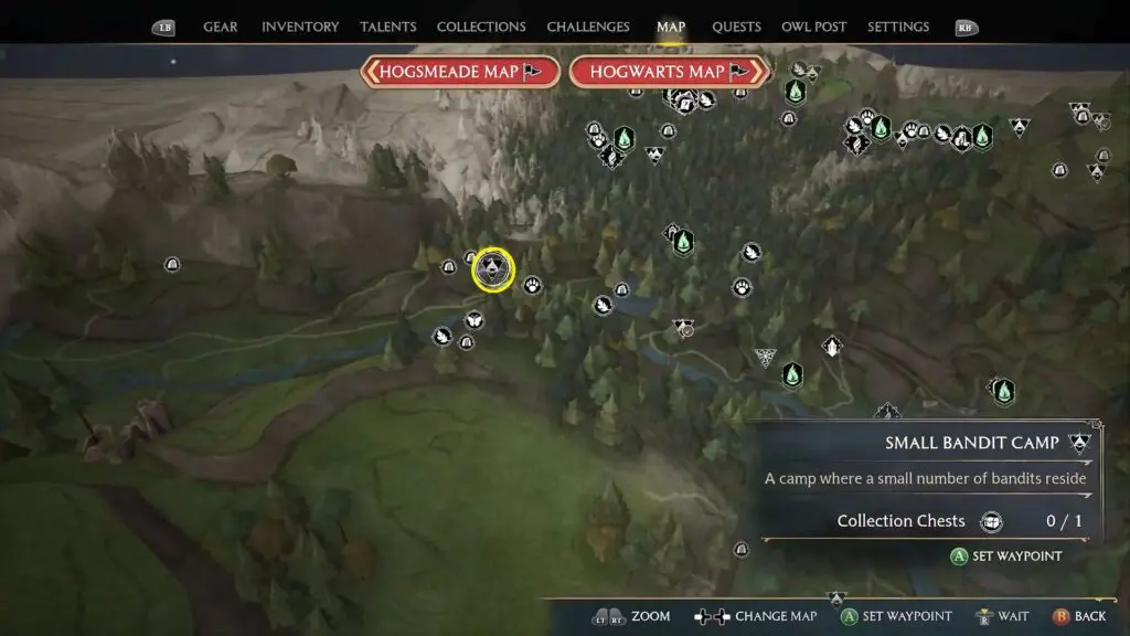 Head south from the East North Hogwarts Region Floo Flames as marked on the map to find the chest inside a tent in a bandit camp.