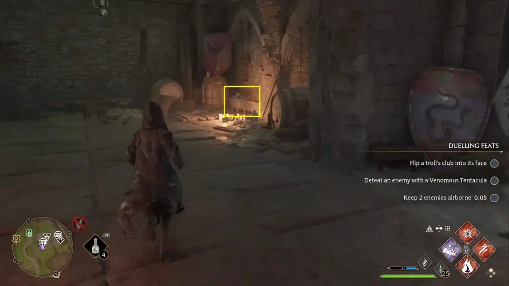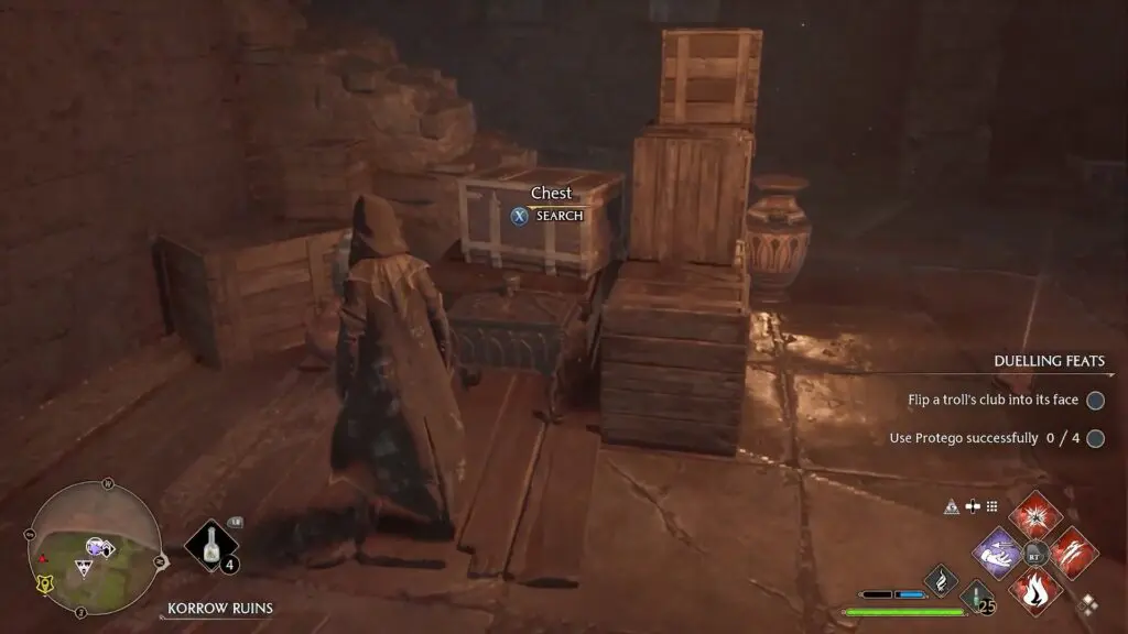Head to the western part of the map to find a bandit camp near Korrow Ruins Floo flames. The first chest is on the first floor near some candles.