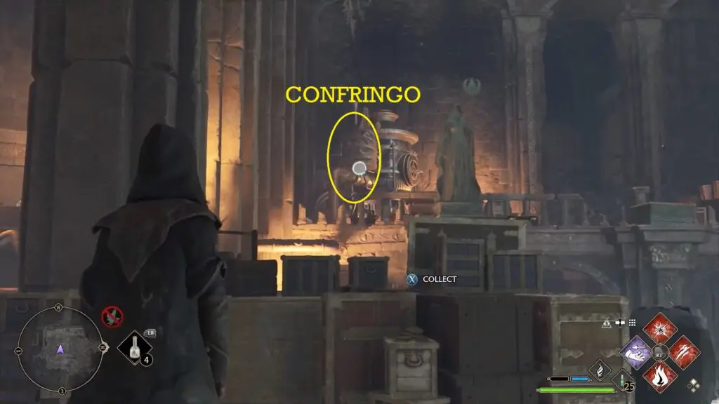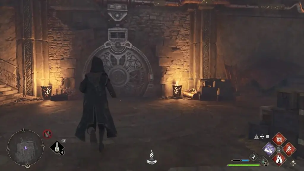 Head inside the ruins and go in the right side (south) direction to reach a bigger hall. Go up the small set of stairs and look to your left to find a steam engine kind of mechanism. Hit the engine with confringo spell multiple times to open the door near the stairs.