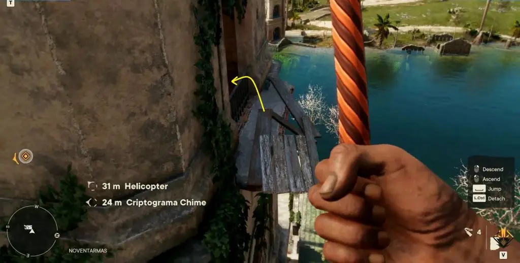 Criptograma Chart #09: The chart is on top of the old tower where the chest is. To get to the top of the tower, jump on the wooden platform at the right side of the chest. Then grapple the hook above and swing and jump on the ledge shown in the second picture below and go inside the tower. Instead of taking the stairs inside, jump out from the other side as shown in the third picture below. Then take the vines to climb up the tower. Then go inside the tower and grapple to reach the top floor. Here you will find the chart.