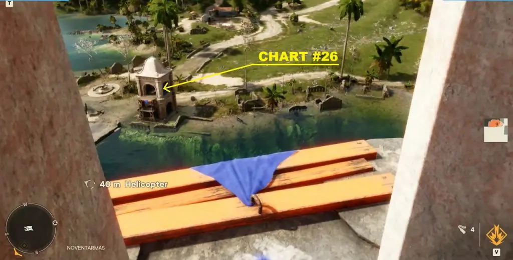 Criptograma Chart #26: From the top of the tower where you found the previous chart, jump down and go west. The chart is inside a small ruin as shown in the picture below. You can either jump to reach the upper floor of the ruin or dive down and enter through an underwater entrance. The diving spot will be marked with a blue icon.