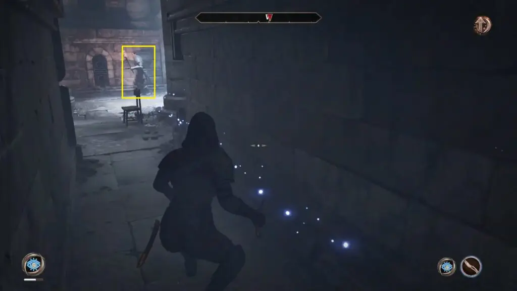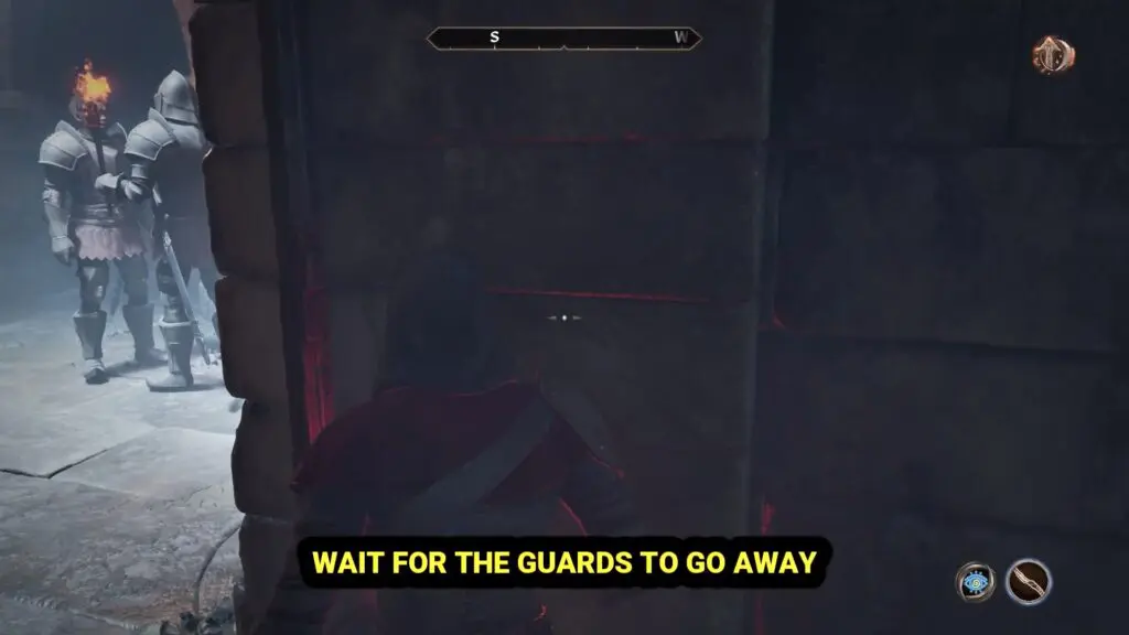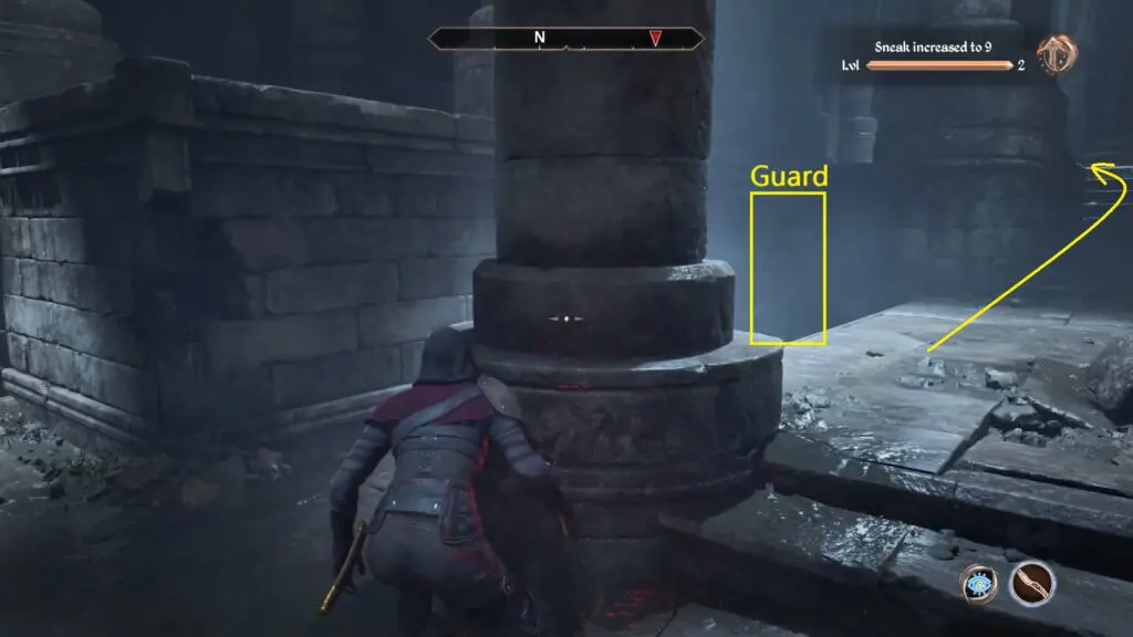 Then, sneak down the hallway. Hide behind the pillar until the guard by the left wall moves. When it’s safe, sneak quietly to the Door to the Imperial Subterrane.