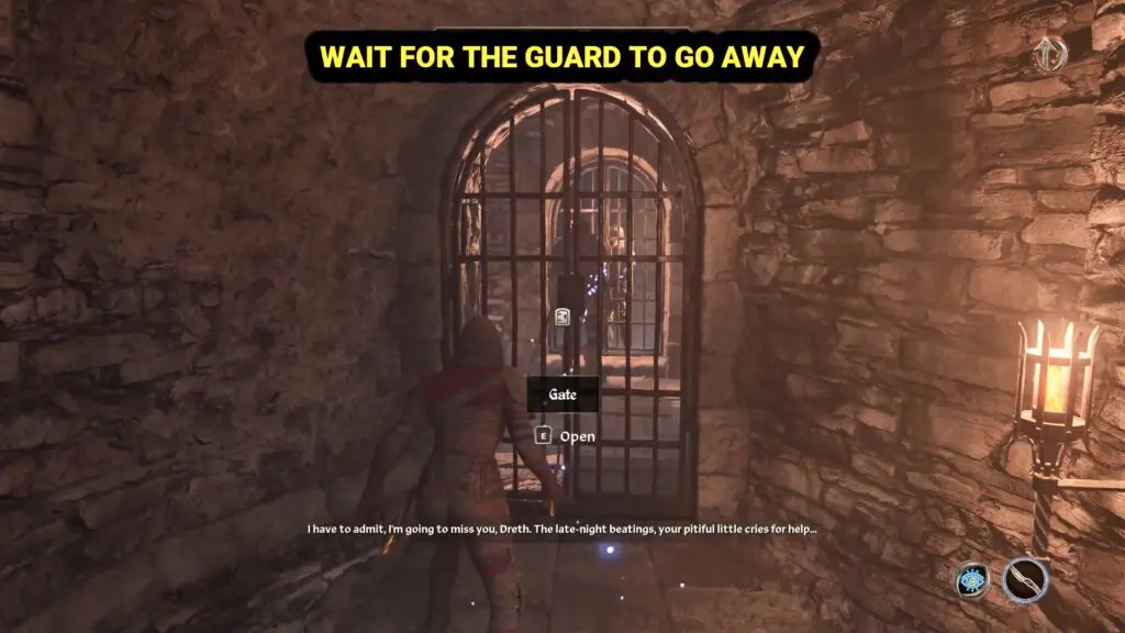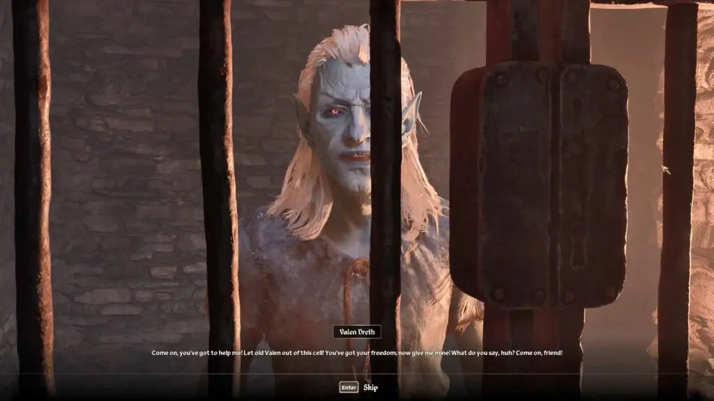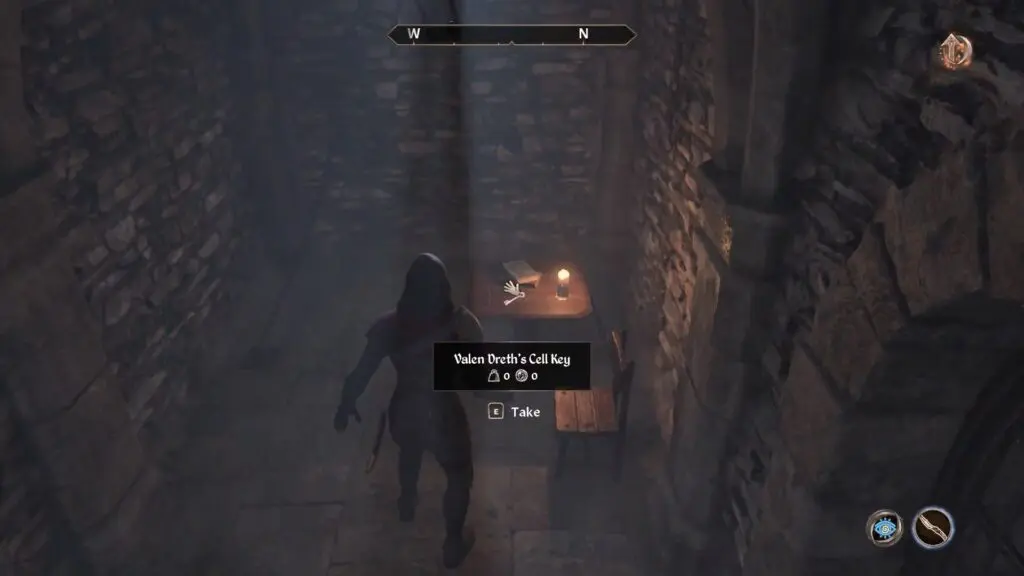Once the guard leaves, go to the left toward the table in the corner. Pick up the keys from the table. Open Valen Dreth’s cell and eliminate him.