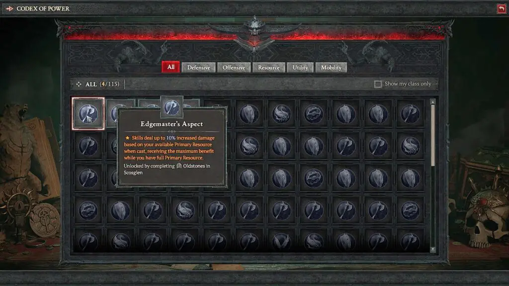 This guide shows how to get the Edgemaster’s Aspect in the Diablo 4 game, released on 6th June 2023. Edgemaster’s Aspect is an offensive enhancement that empowers your skills to deal up to 10% increased damage based on your available primary resource when cast, receiving the maximum benefit while you have full primary resource.