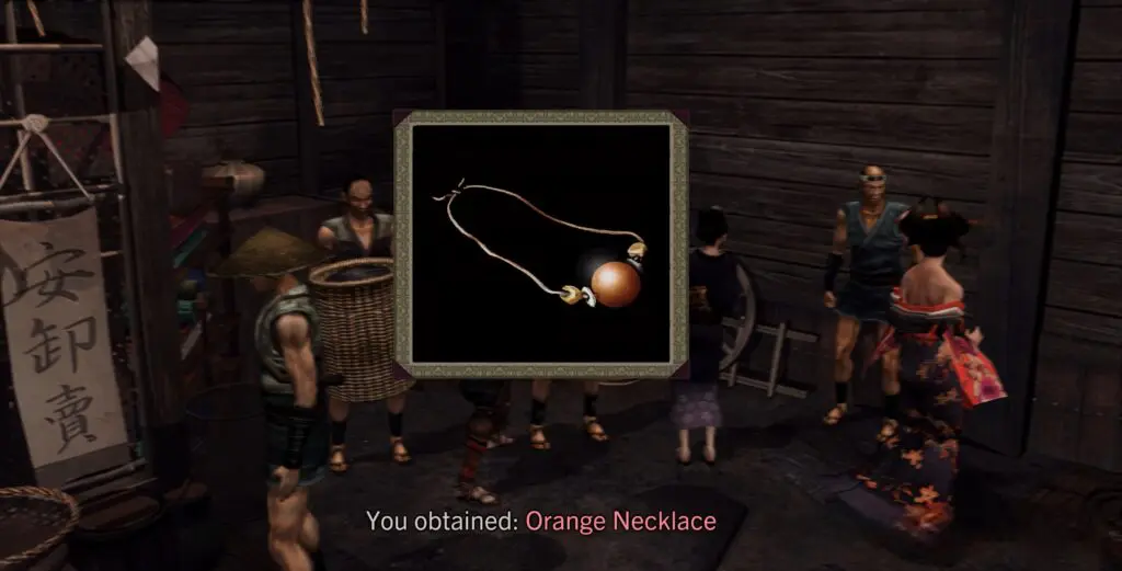 On your third visit to Imasho Town (after completing Gifu Castle), return to the item shop. A new NPC will be standing next to the man who originally gave you the “Chalk.” Talk to him, and he’ll reward you with the Orange Necklace