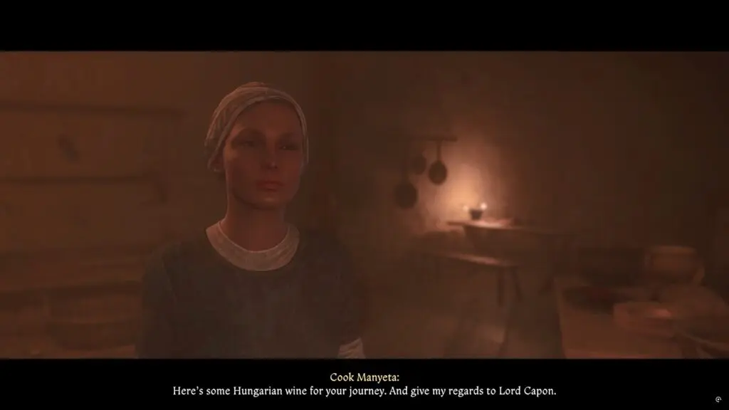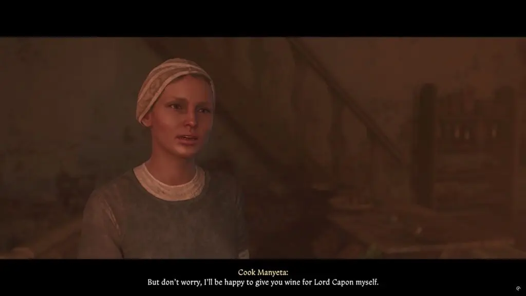 As Henry progresses through the main mission ‘For Victory‘ in Kingdom Come Deliverance 2, he needs to get wine from the kitchen. Go into the kitchen in the morning time and speak with Cook Manyeta is in the kitchen. Talk to her and ask “Where’s Katherine?” as you need to bring some wine for Lord Capon.