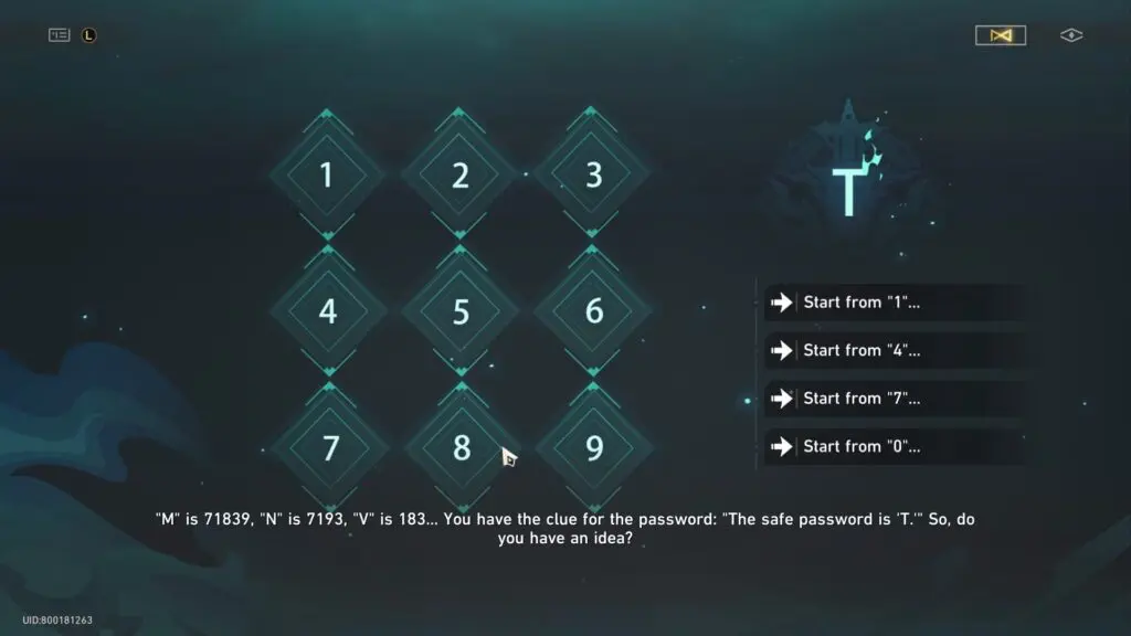 The puzzle is based on the nine-square grid numbers that need to be pressed in the correct sequence. A clue as per note is: M is 71839, N is 7193, V is 183, then the safe password is “T”
