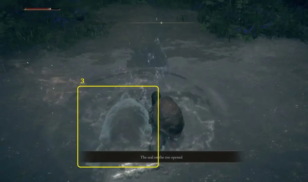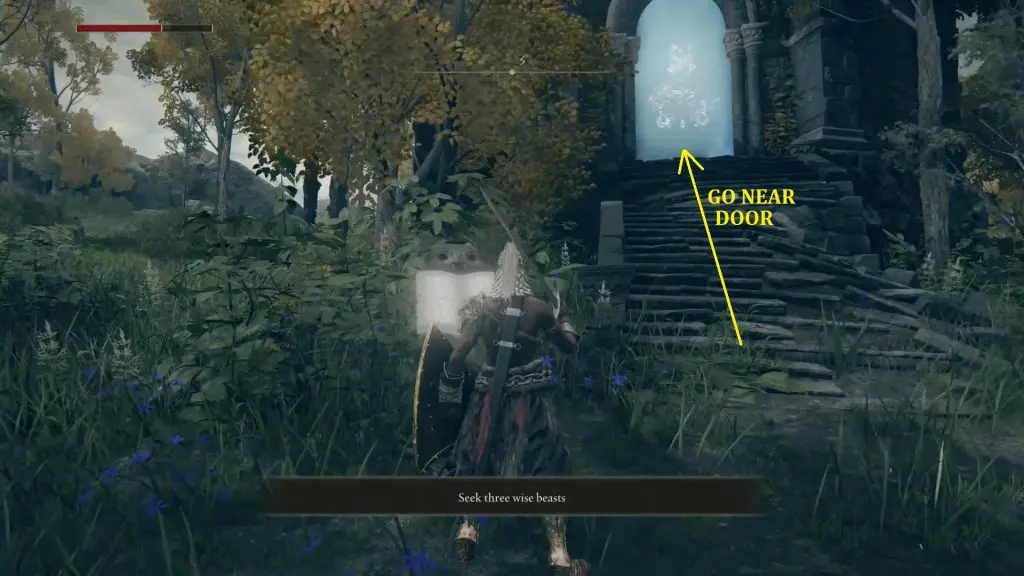 Read the note at the bottom of the stairs of the tower. The note says “Seek three wise beasts”. After reading the note, climb the stairs and go near the sealed door as shown in the picture below. This will make tree turtles spawn in the area. You will have to find and hit the three turtles to break the seal of the door.