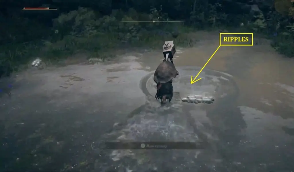 The third turtle is a bit difficult to find. Go to the small pond on the south side of the tower. At the center of the pond, you will see ripples in the water as shown in the picture below. The third turtle is underneath the water at this location. Hit the water and this will make the turtle appear. Hitting the three turtles will unseal the tower. Enter the tower and climb up the ladder. At the top of the tower, you will find a chest containing a Memory Stone.