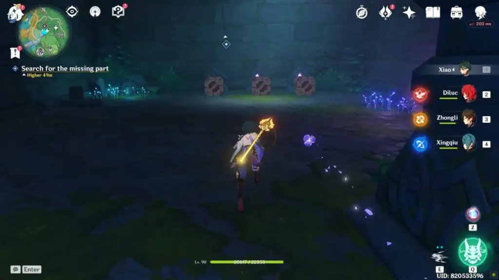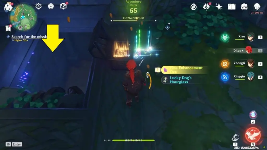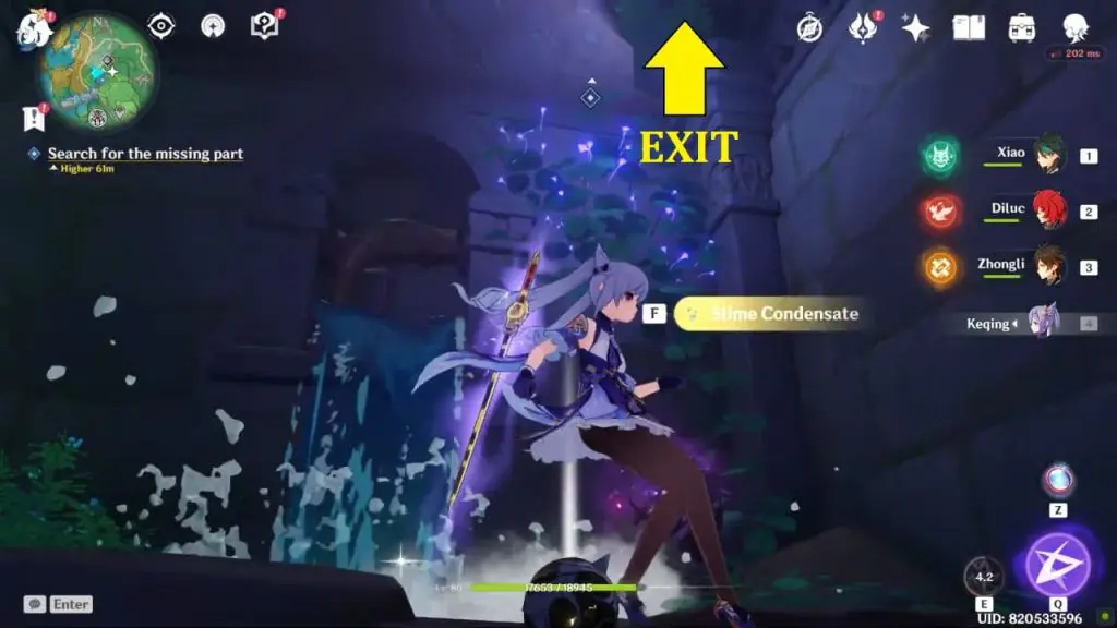 Return to the ward and use elemental sight. This time, the trail will take you east to a hole. Before entering the underground cave, you can summon an electrogranum. You’ll notice an electro barrier as you glide down, and you’ll be able to pass past it because you’ve previously summoned Electrogranum.