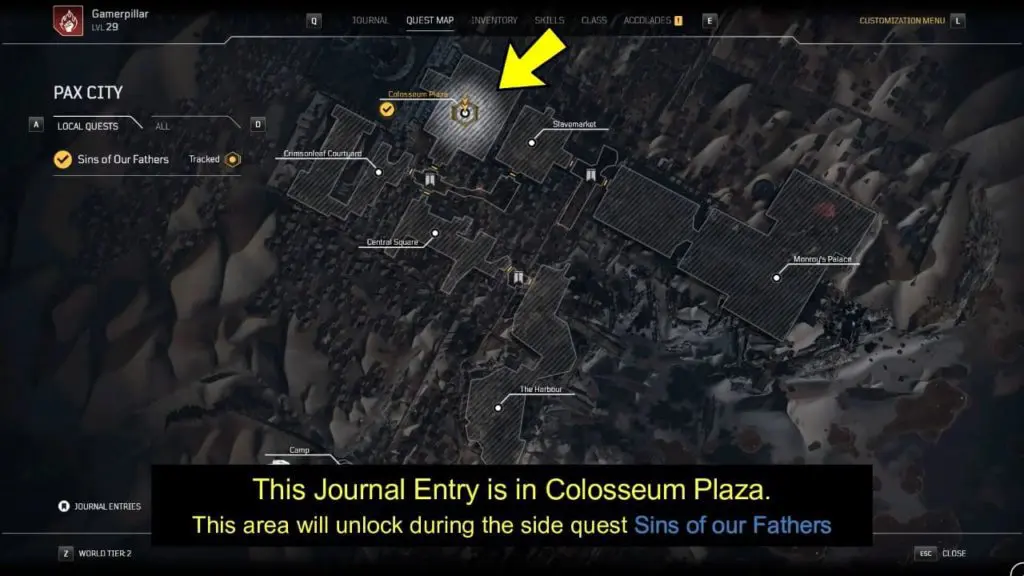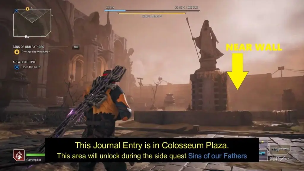 This Journal Entry is in the Colosseum Plaza as shown in the image. The area will get unlocked during the side quest “Sin of our Fathers“.
