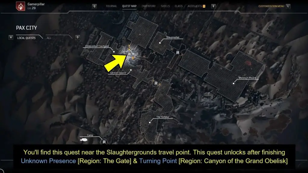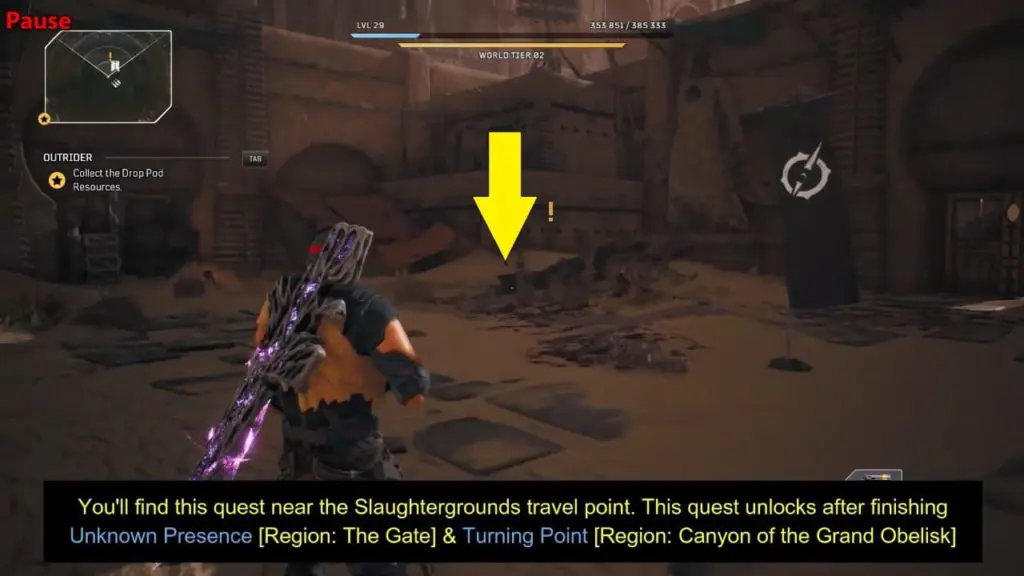 You will find this side quest near the ‘Slaughtergrounds‘ fast travel point. This quest unlocks after finishing “Unknown Presence” of The Gate region and “Turning Point” of Canyon of the Grand Obelisk region.
