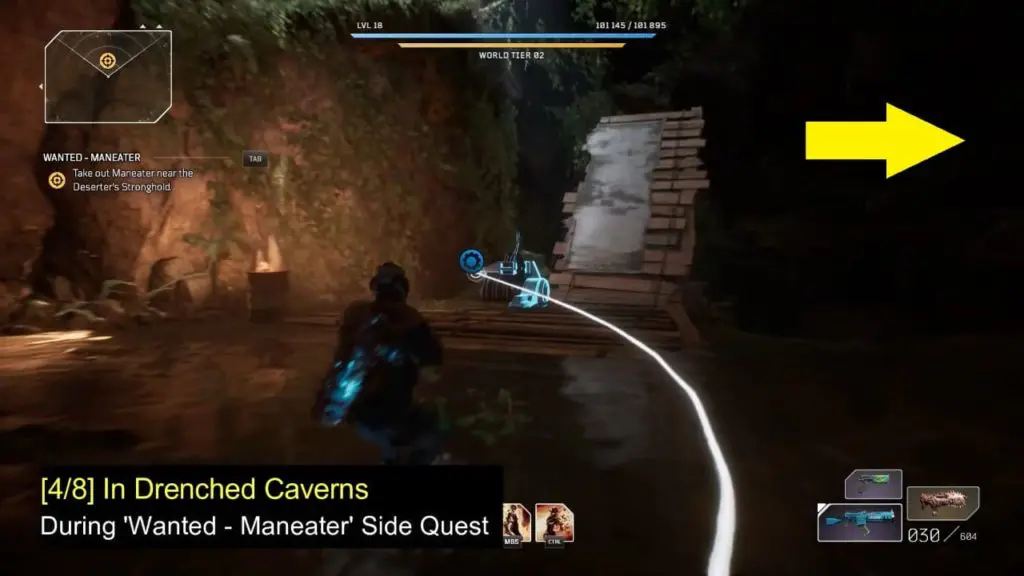 The Journal location is Drenched Caverns. This journal is part of the side quest ‘Wanted – Maneater‘. You will get the area objective ‘Lower the Bridge’. You can find the journal on the right side of the Bridge on a raised ground near iron drums.