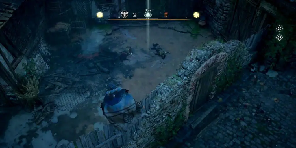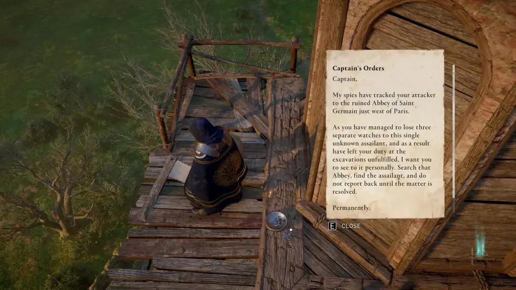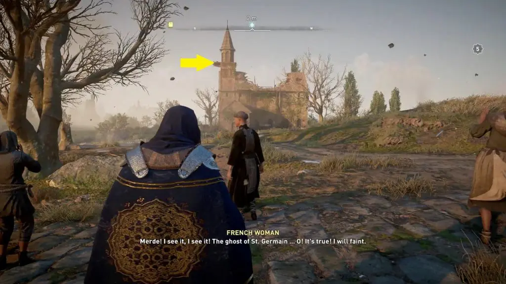 You will find this mystery south of Sigfred’s Forward camp as shown in the picture below. At the highlighted location you will find some villagers talking about seeing the ghost of Saint Germain at the roof of the chapel (See the third picture below). Climb to the top of the chapel, where you will find a note near a dead body. Read the note titled “Captain’s Order” to complete the mystery event.