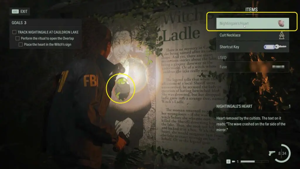 Once you’ve fought the two enemies, you’ll be able to access the Witch’s sign with the hole in it. Interact with the sign to place the heart through the hole, and things will begin to change.