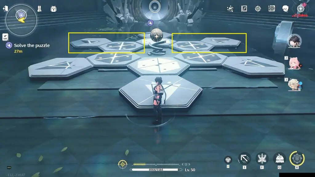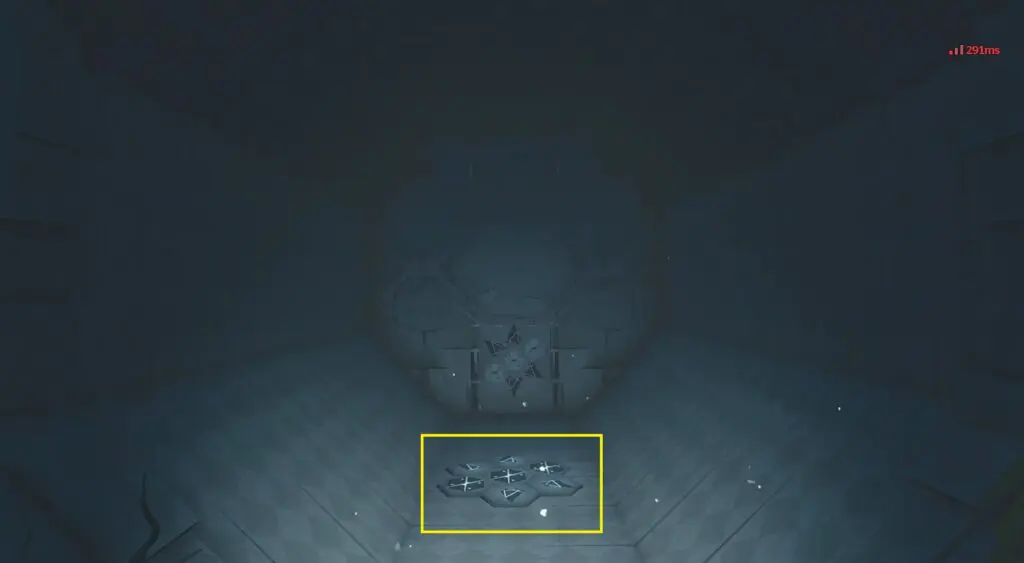 The pattern in the picture below shows the initial pattern on reset. Perform plunging attacks on the four buttons marked in the picture below to turn them white. This will solve the puzzle. The final correct pattern is shown in the second picture below. A chest will spawn on completion of the puzzle. Open the chest to complete the domain.