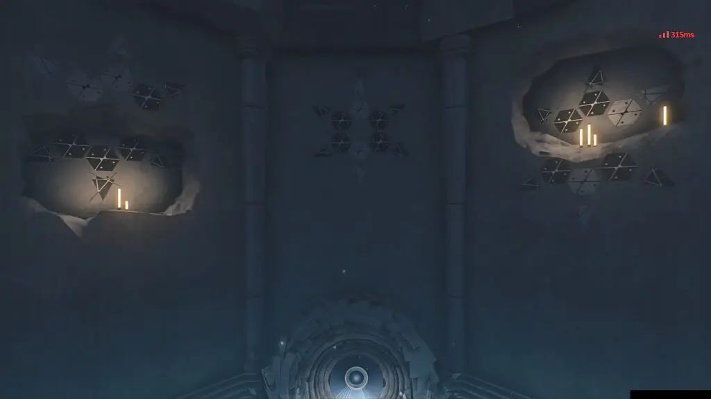 Interact with the spherical mechanism and use it to rotate the wall. Rotate the walls until the three patterns on the walls are clearly visible as shown in the picture below. Overlap the three symbols. White overlapping with black will form a white symbol. Make the symbols on the floor match with the overlapped symbols to solve this puzzle.