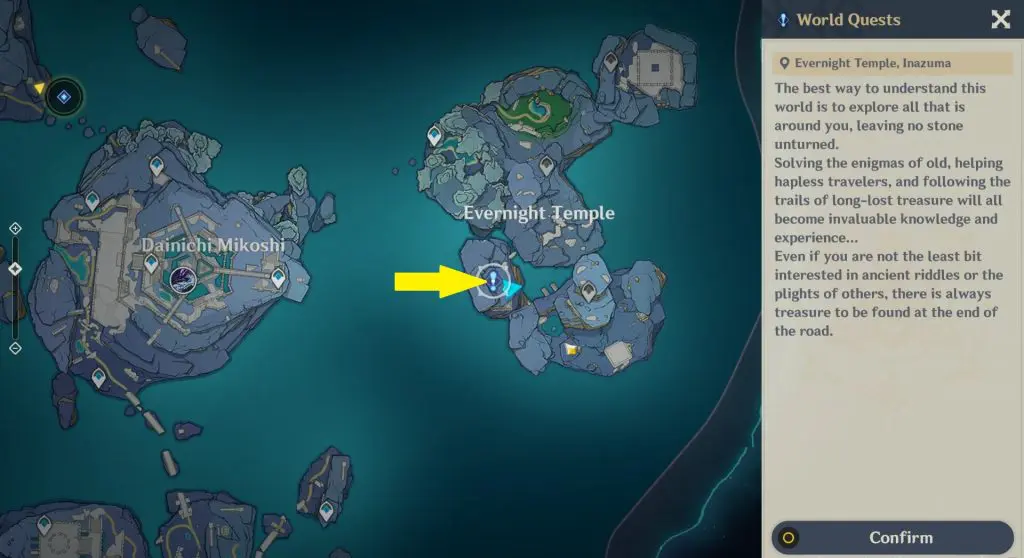 Go to the Evernight temple at the location marked in the picture below. Here you will find 5 Seals. Undo the seals using Key Sigils, which you will find around in the Enkanomiya area. On unlocking the seals, Aberaku will appear. Talk to him to start the “Temple Inquiry” quest. Talk to Aberaku again to start a challenge. Complete the challenge to obtain an Offerings of the temple.