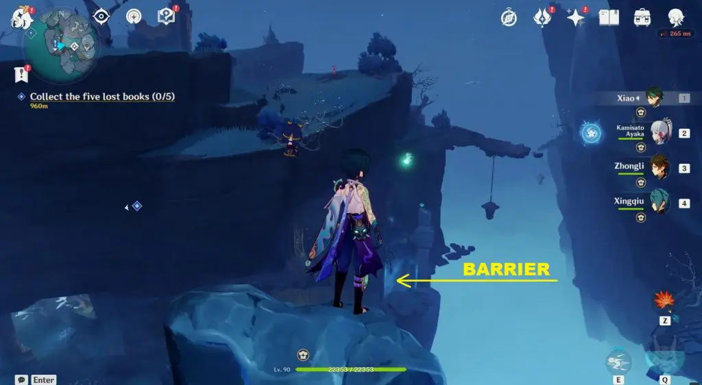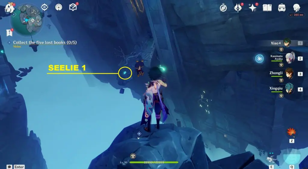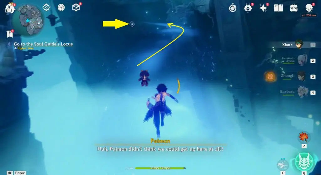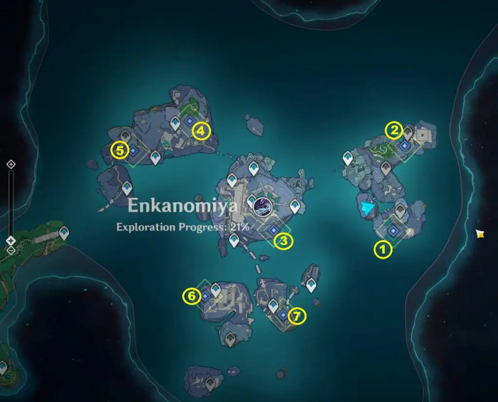 Go to The Narrows at the location marked in the picture below. Here you will find 5 Seals. Undo the seals using Key Sigils, which you will find around in the Enkanomiya area. On unlocking the seals, Aberaku will appear. Talk to him to start the “Temple Inquiry” quest. Talk to Aberaku again to start a challenge. Complete the challenge to obtain an Offerings of the temple.