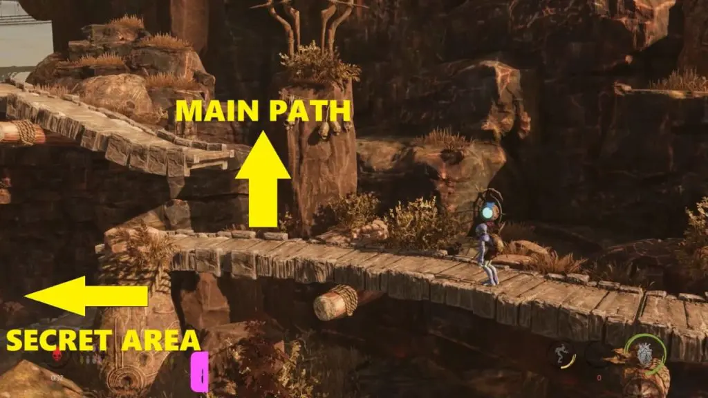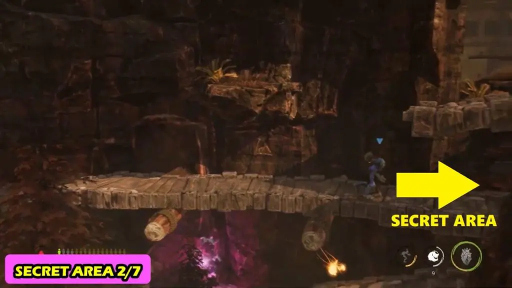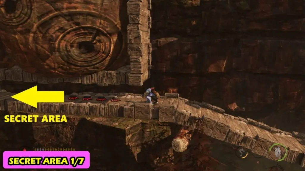 You can find the first secret area in the initial part of the game. As you start the journey, you will come across a deviation from the main path. Drop down to another path. Here you have to collect stones by jumping from the ledge. These stones will come in handy to clear mines ahead. You will find the secret area at the end.