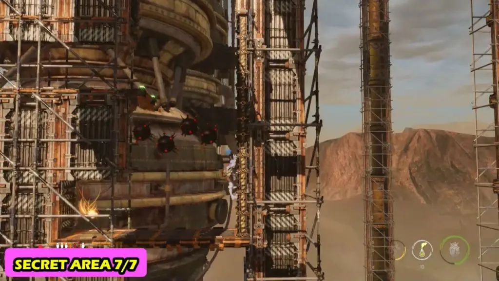 After the first train ride, you need to go in the left direction and use the elevator to go down. Now use a wheel to open the path and jump through platforms to move ahead. Just before the last wheel, jump down a level below from the main path. There clear a few boxes to find the secret area.