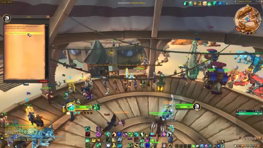 Speak with Alyx at the main tent of the Caverns of Time to pick up the prerequisite quest – A Pirate Predicament. She is wearing a white dress and is the Volunteer Assistant Guest Relations Manager.
