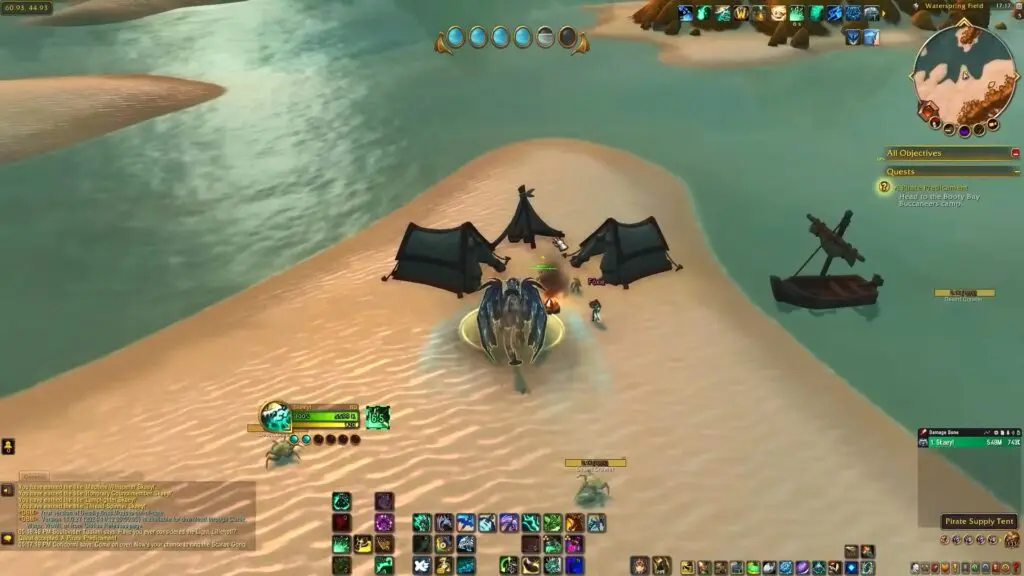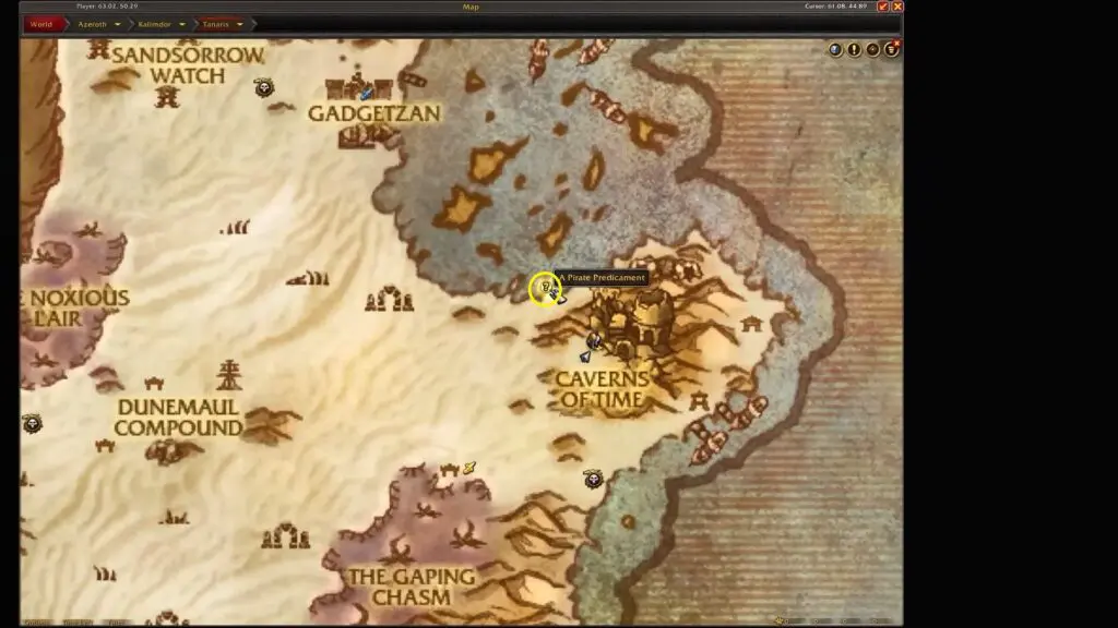 This prerequisite quest will guide the reader in the northwest direction from the carven of Time. Fly to the location marked on the map to find some tents on the shore. Speak with the Goblin at the camp to start the “Pirate Foods and Superstitions” quest.
