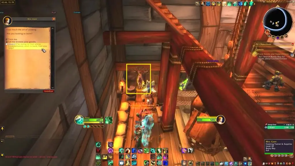 Head to the marked location in Booty Bay to find Mrs. Gant, the cooking trainer.