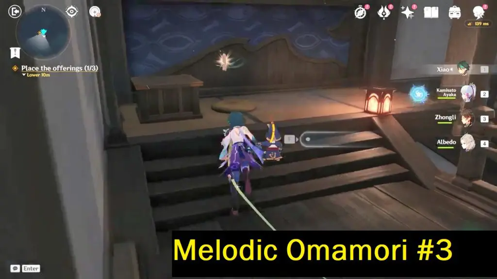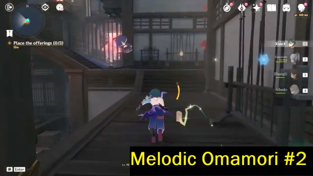 Continue to follow the corridor to find a second Melodic Omamori. Place the Melodic Omamori on the shrine after the second big stairs.
