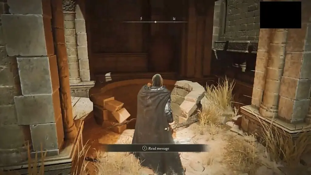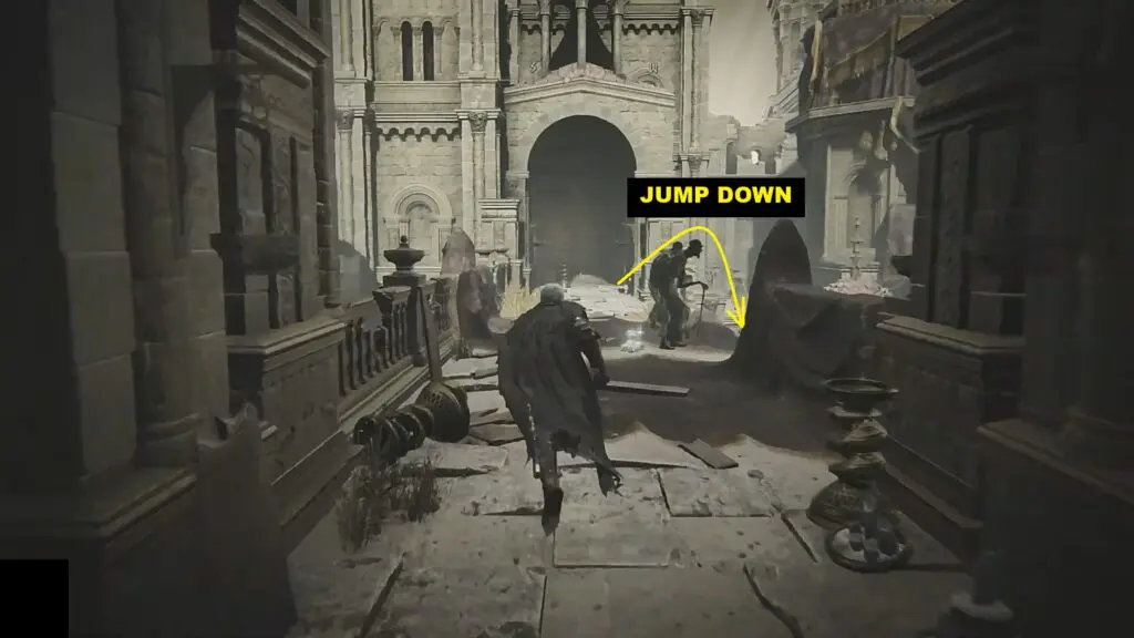 Trace your path back to the Small Private Altar Lost Grace. Exit the room from the door next to the Small Private Altar Lost Grace. Then go through the door on the left side to exit the building. Now jump down from the right side of the bridge as shown in the picture below.