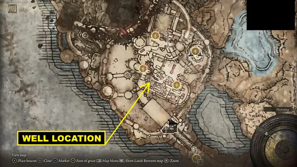 Proceed straight ahead until you reach the fountain at the end of the path as shown in the picture below. Then turn left to reach the well as shown in the second and third pictures below. Go down the well and use the Well Depths Key to open the gate there.
