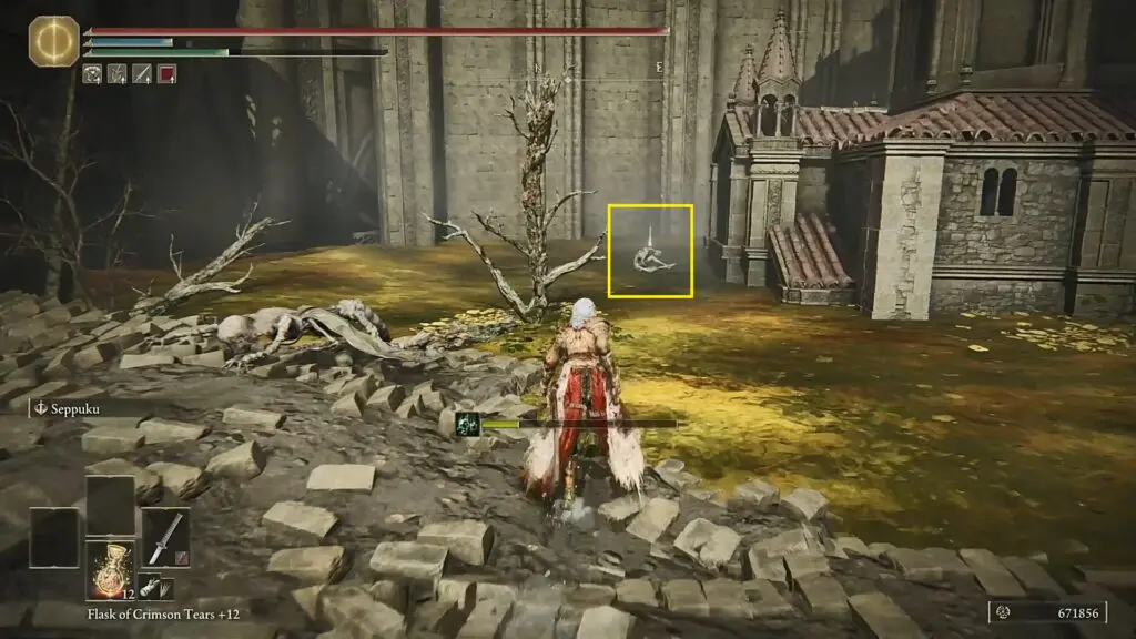 After opening the gate, proceed ahead to reach the swamp. Then turn right and go till the end to find the weapon on a corpse as shown in the picture below.