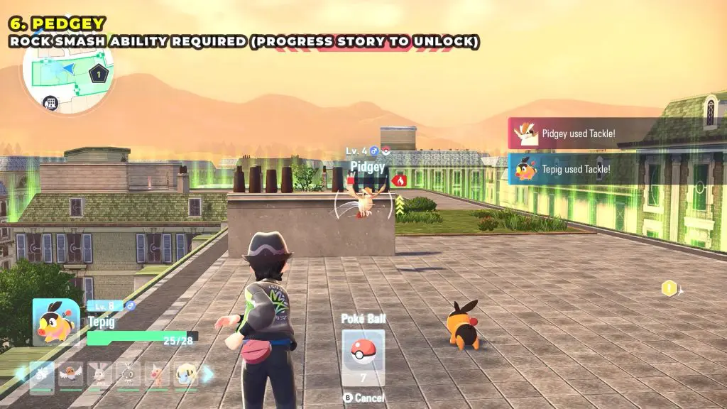 Pidgey is a Normal- and Flying-type Pokémon that appears in Pokémon Legends: Z-A. You can find it perched on a rooftop in the northern part of Area 1. Use the ladder to climb up and reach it.
