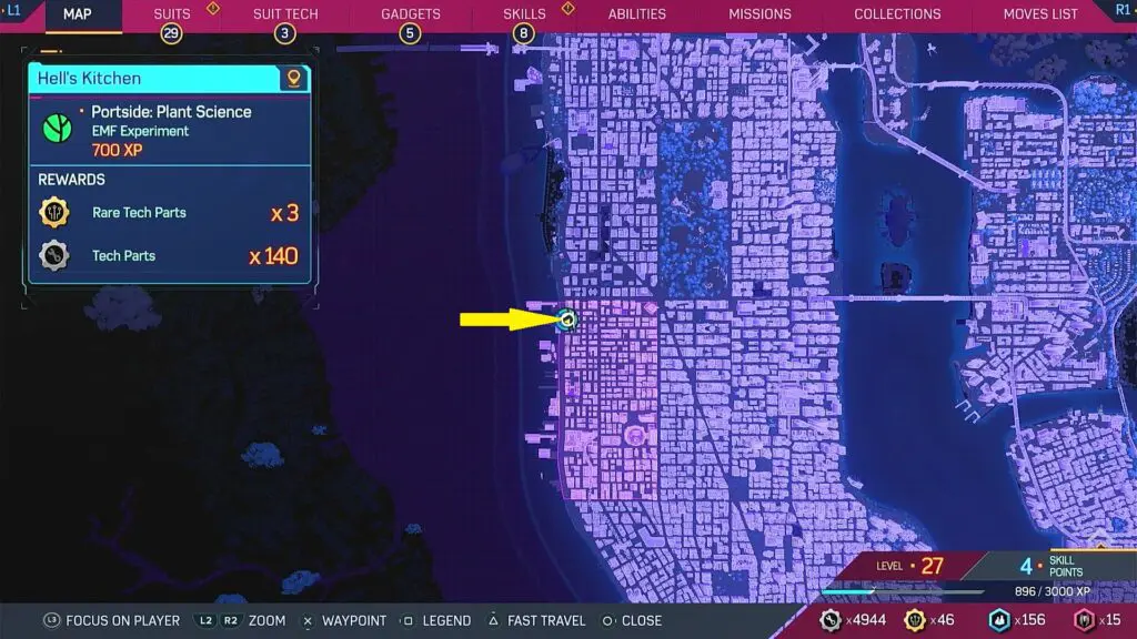 This guide shows how to complete the Portside Plant Science EMF Experiment in the Hell’s Kitchen district in the Spiderman 2 game, which released on 20 October 2023. Click here for Hell’s Kitchen All Collectibles Guide.