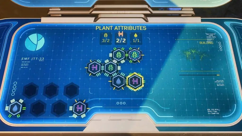 To solve the puzzle, you need to place the Hex genes in the correct empty slot. Each side of a Hex Gene will have either 1,2,3, or 4 lines. Only the hex genes with the matching sides can be placed next to each other. For example, the side with two lines can only be attached to another Hex Gene’s side with two lines. The puzzle is randomly generated. The solution to the puzzle that I got is shown in the second picture below. Solving the puzzle completes the experiment.