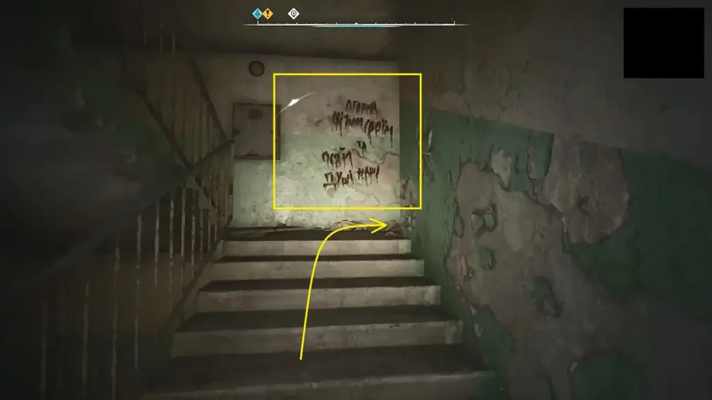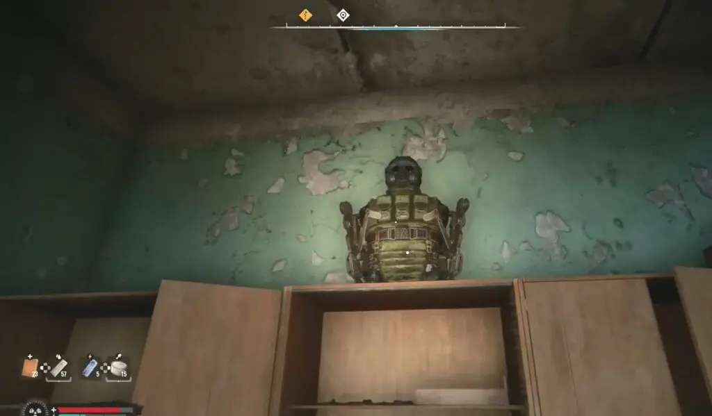Go inside the building as shown in the picture below and climb up the stairs. Keep climbing until you reach the floor with something written on the wall in red color as shown in the second picture below. Enter the apartment on this floor and go to the room on the left to find the Brummbar Exoskeleton as shown in the third picture below.