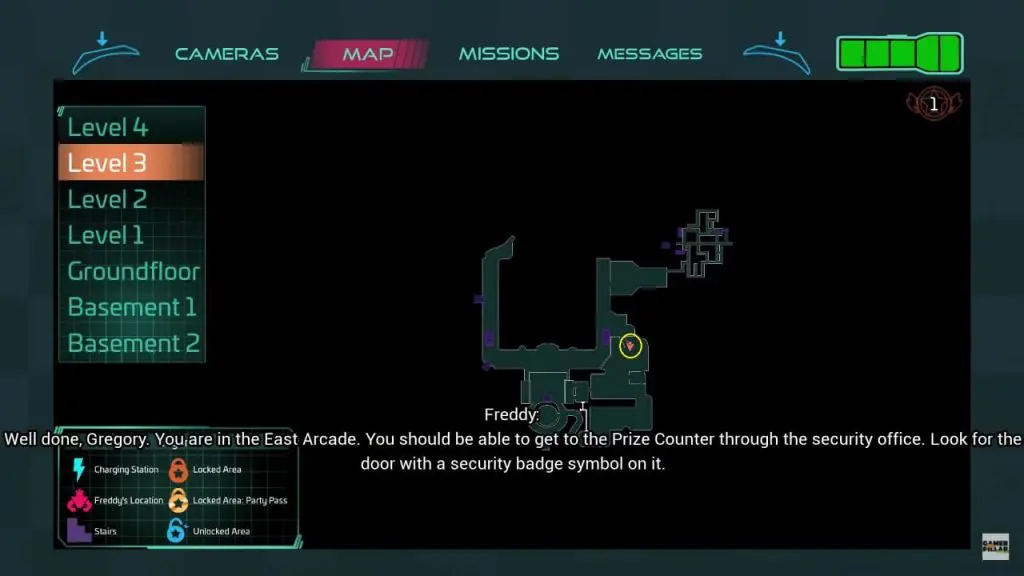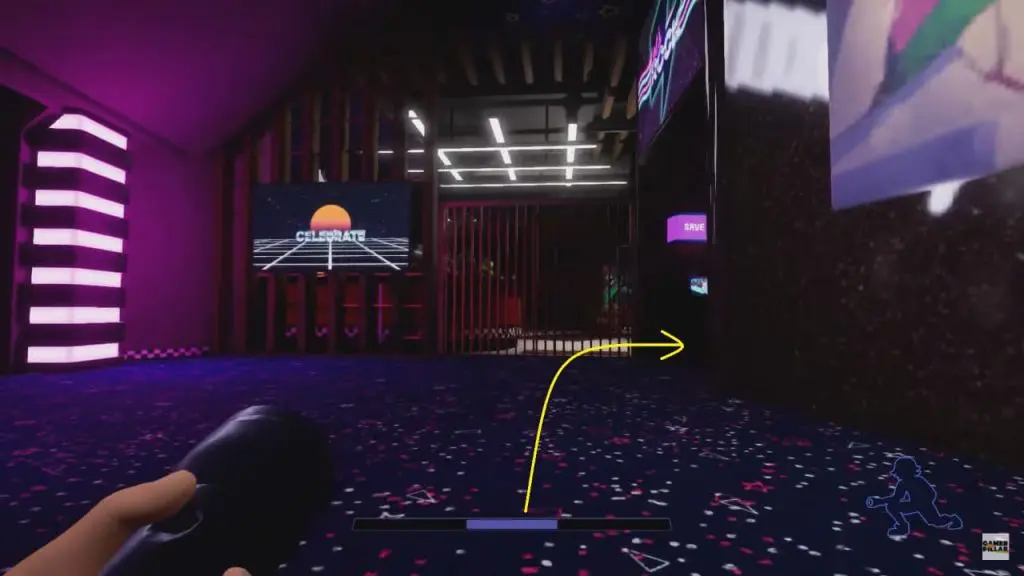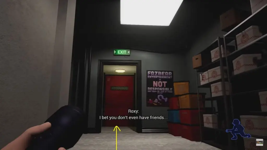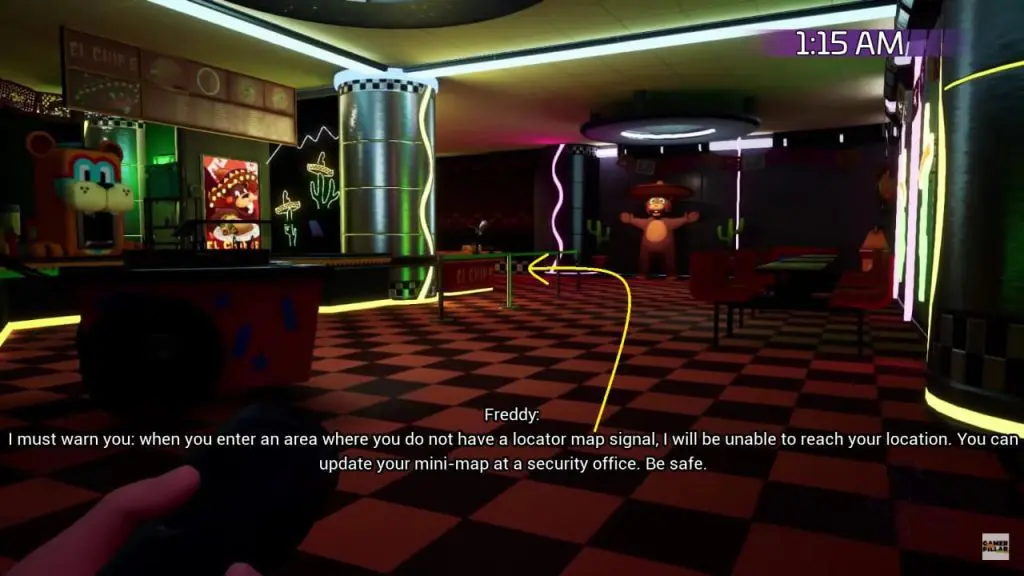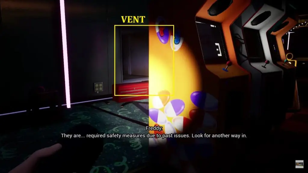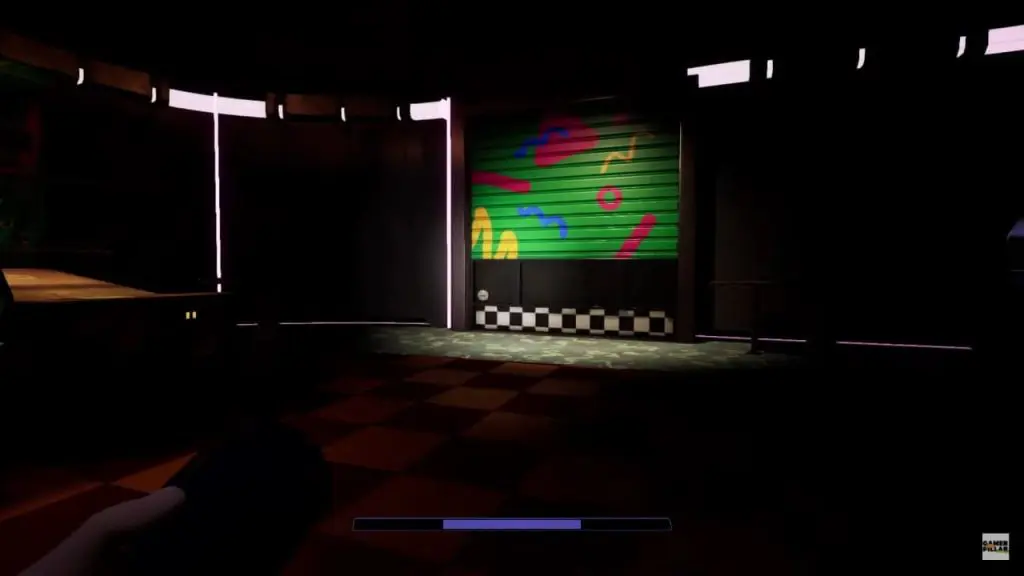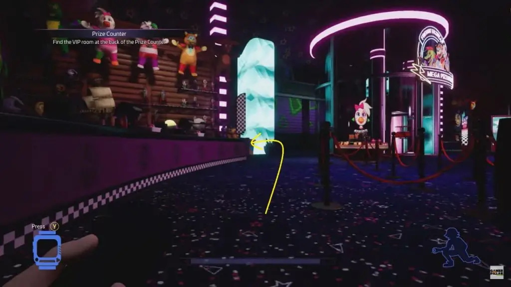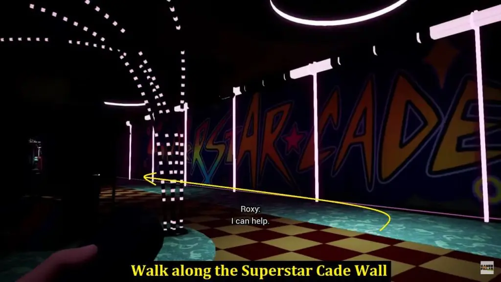 As the Security Office is locked, Freedy will direct you to the back of the office by walking past the Superstar Cade Wall on the left as shown below. Shutter doors at the very end of the arcade could be your path to the security room. Roxy and bots will patrol all around the arcade. The best route to success here is to stick to the walls as much as possible and hide behind arcade cabinets and photobooths.