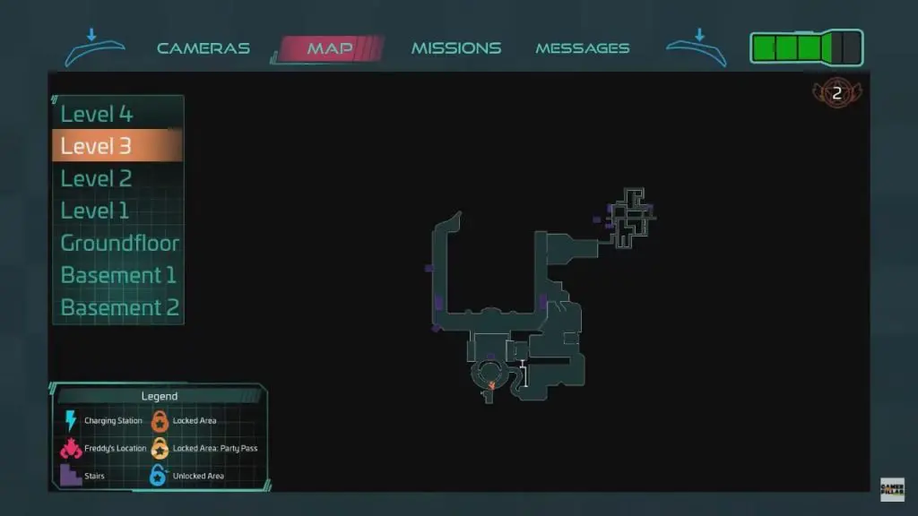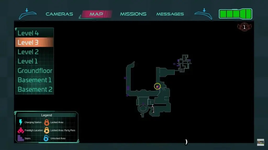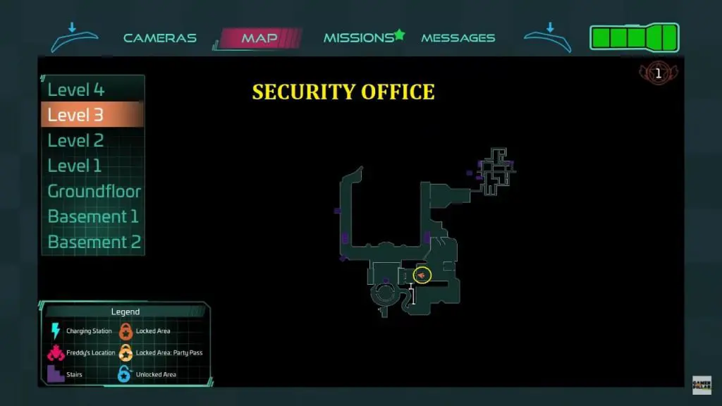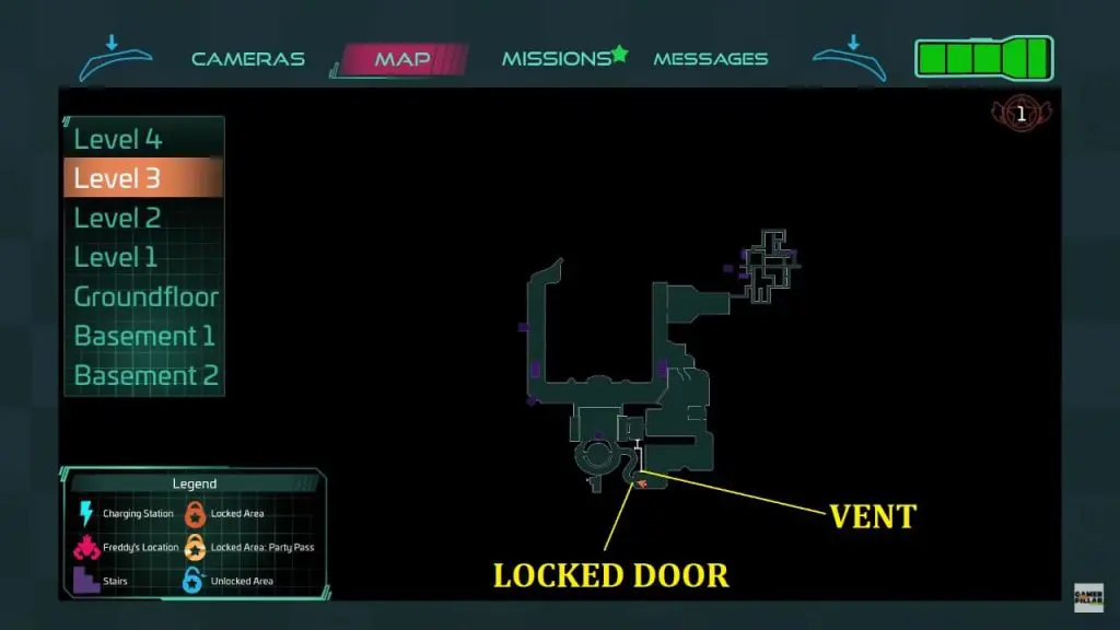 You will find the door at the back of the office (behind the superstar cade wall) also locked. Freddy will again instruct you to find another way into the security office. There is a vent on the right wall near the locked door. To get to the security room, go inside the vent. For your convenience, I’ve marked the location on the map below.