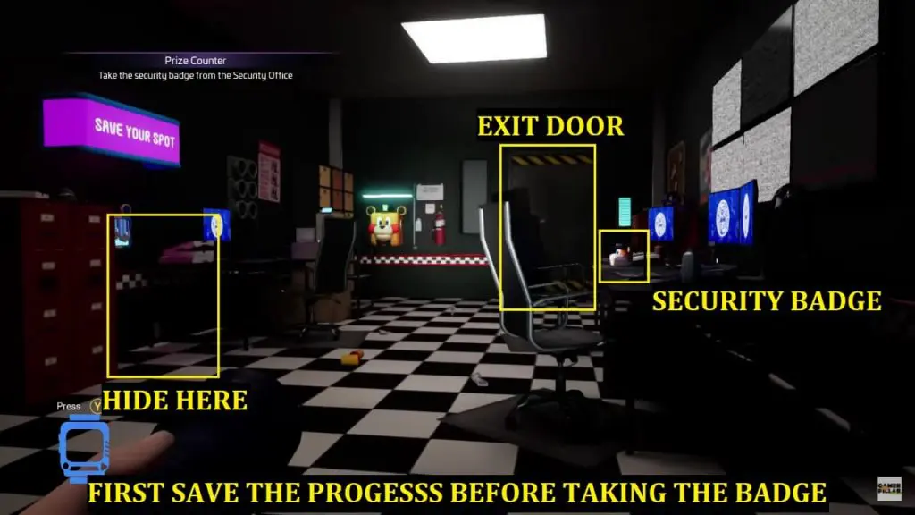 Once the alarm gets triggered. Roxy and Monty will enter the exterior office and begin hunting you. At this point, crouch and hide up against the wall with the save station (as shown above) on it as this is the easiest way to survive the lockdown for 3 minutes.