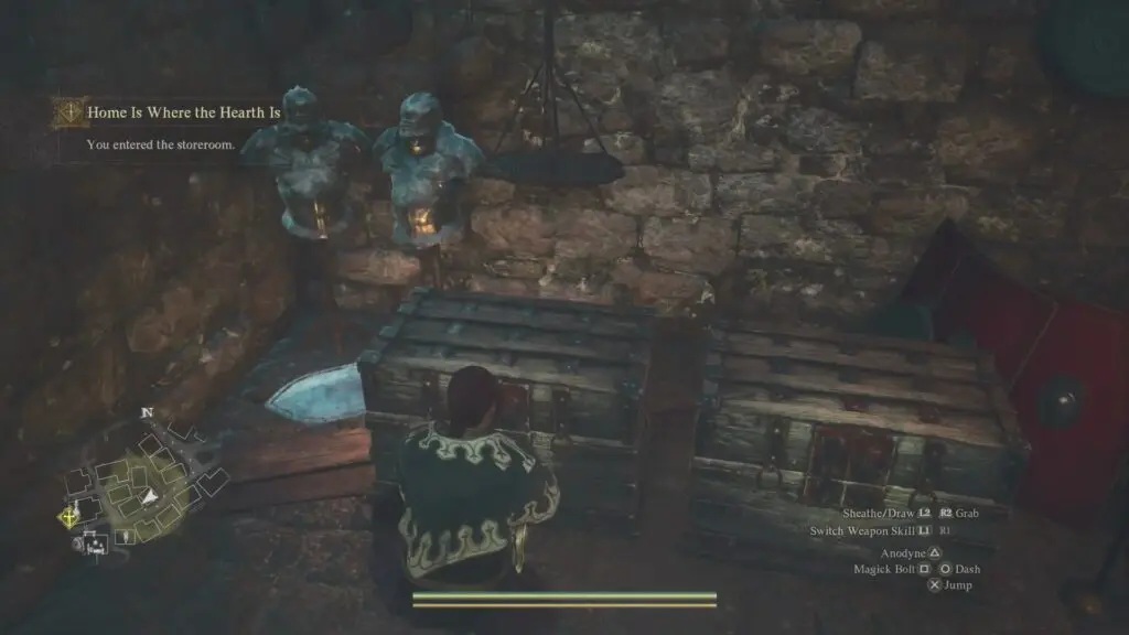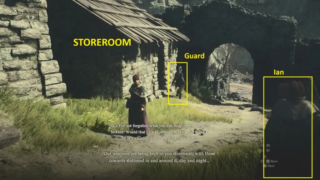 If you have already finished the side quest “Brothers Brave and Timid” then Ian (NPC) will help you to distract the guard. You can sneak inside the storeroom and grab the swords from the chests.
